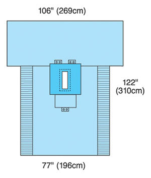 Product Description: Packs include: Laparotomy Drape with 25 1/2\" x 26\" absorbent reinforcement; 4\" x 12\" fenestration with adhesive; instrument pad; gusseted armboard covers; cord-holding tabs; Mayo stand cover, reinforced poly, 23\" wide; suture bag; Four drape towels, adhesive, nonabsorbent.