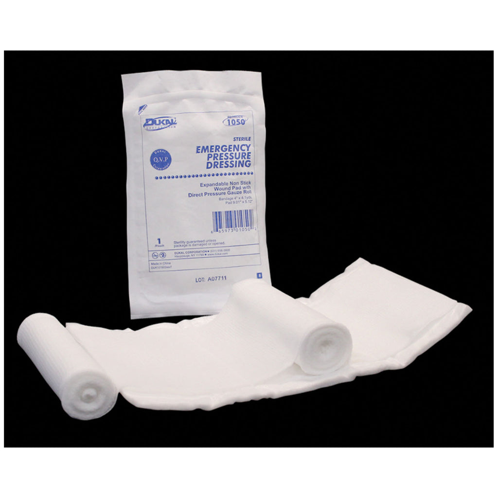 Product Description: The Dukal Emergency Pressure Dressing is an all-in-one dressing. It is specifically designed with a highly absorbent pad that offers maximum compression when held in place with the attached bandage roll.