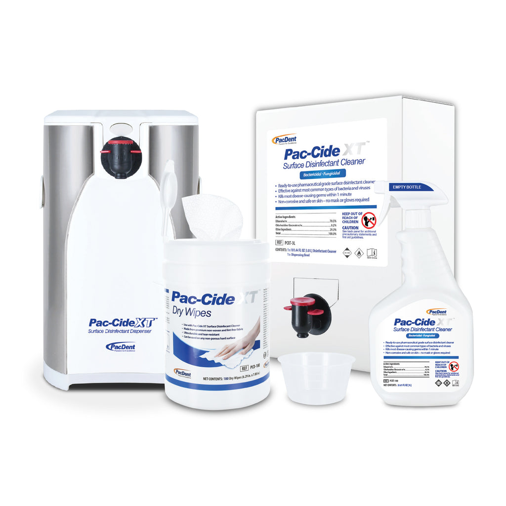 Surface Disinfectant Cleaner Premium Starting Kit, Includes: (1) Pac-Cide XT 3 L Solution with Cardboard Dispenser & Dispensing Bowl, (1) Pac-Cide XT Dry Wipe, (1) Pac-Cide XT Stainless Steel Dispenser, and (1) Pac-Cide XT 1 L Spray Bottle ( Empty), 1kt/cs (US Only) (Item is considered HAZMAT and cannot ship via Air or to AK, GU, HI, MP, PR, VI)