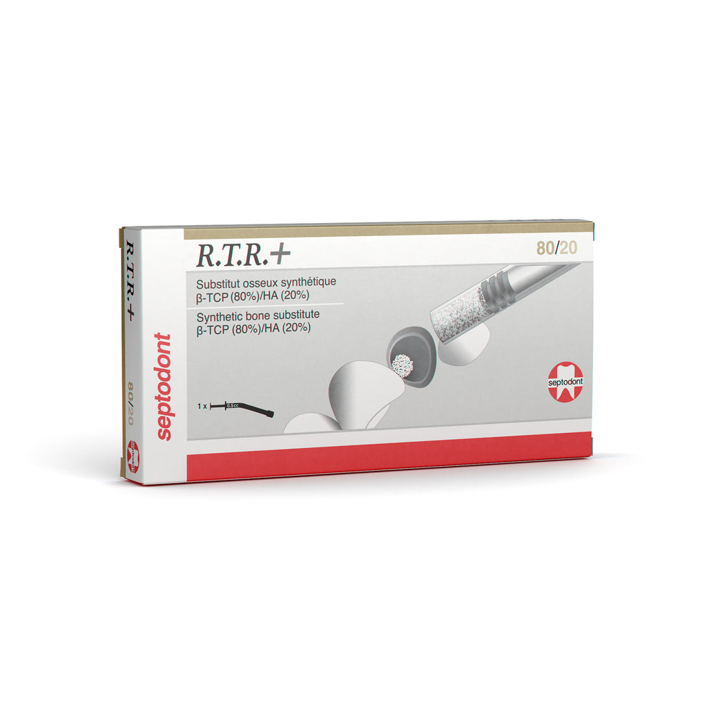 Product Description: RTR+ synthetic bone substitute is a bone void filler consisting of beta-Tricalcium Phosphate (B-TCP) and Hydroxyapatite (HA), both fully resorbable. Available in two bone regeneration options: 80/20 (80% B-TCP/20% HA) rebuilds bone in 3-9 months; 40/60 (40% B-TCP/60% HA) rebuilds bone in 9-12 months.