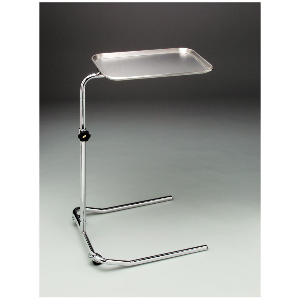 Product Description: Secure height adjustments from 28\" to 48\". Mobile base includes locking casters. Base width 20\". Removable stainless steel tray 12 1/2\" x 18\". 11 lb weight capacity.