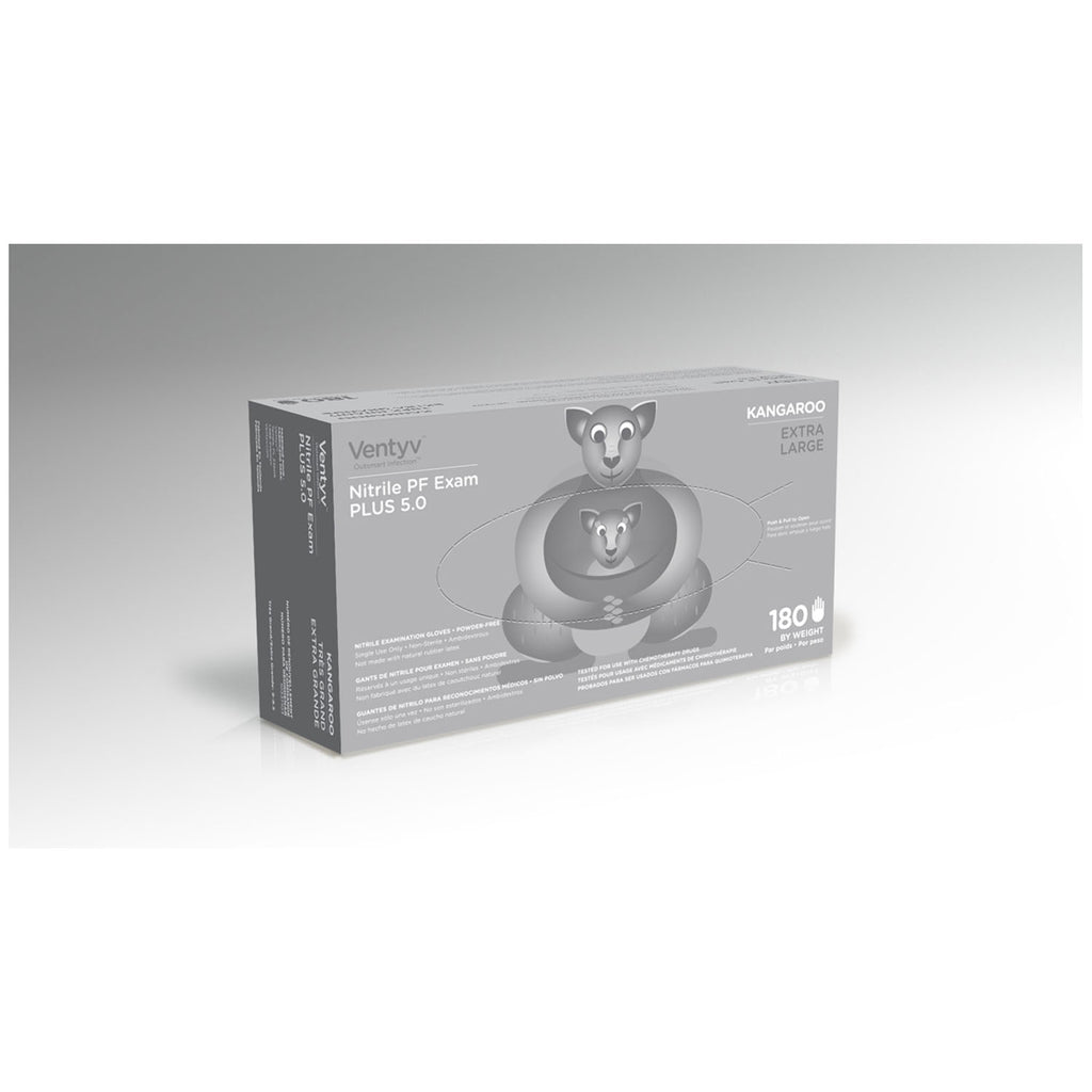 Product Description: Ventyv ™ Nitrile Powder Free Exam Glove Plus 5.0 (Kangaroo) offers outstanding barrier protection with the fit and feel of a traditional nitrile glove. Tested for use with chemotherapy drugs. Color-Blue. Available in sizes XS-XL. Powder-Free (PF) and textured fingertips enhance wet and dry grip. Beaded cuff and ambidextrous. Non-Sterile.